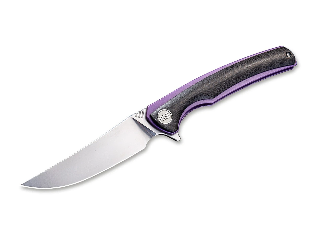 Das 704CF-B von WE Knife ist mit Kohlefaser-Griffschalen über violett anodisierten Titanplatinen ausgestattet. Sein leichter Griff wird gepaart mit einer von Hand satinierten Böhler M390-Klinge. Der Einsatz eines Kugellagers bietet ein reibungsloses Öffnen für eine reaktionsschnelle und zuverlässige Einhandbedienung. Es ist mit einem violett anodisierten Tip-up Titanclip ausgestattet.