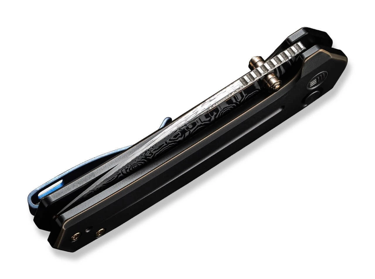 Nur widerspenstige Schneidarbeiten dürften das WE Knife Culex (dt. Mücke) als lästigen Plagegeist erachten. Denn alleine durch die mythische Klinge aus Heimskringla Damast und dem bronzefarbenem Titangriff wird ein Juckreiz im Belohnungszentrum des Gehirns ausgelöst, weshalb der bestechende EDC Folder mit Daumenpin und Button Lock großen Anklang finden wird. Mit Clip (Tip-up/r).
