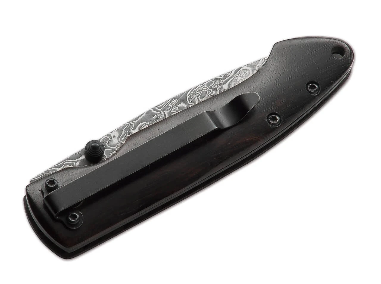 Das Böker Plus Damascus Gent II ist ein nobles Gentleman-Taschenmesser mit nur einer Stahlplatine. Die kleinere Ausführung des extrem leichten und flachen Messers bietet noch mehr Tragekomfort bei gleicher, exklusiver Ausstattung. Das dunkle Ebenholz und die ausdrucksstark gemaserte Damastklinge mit 67 Lagen ergeben eine schlichte, beeindruckende Eleganz. Dieses seltene Edelholz besitzt eine hohe Dichte, ist sehr robust und hat eine hohe Alterungsbeständigkeit. Der Daumenpin erleichtert das Öffnen des Messers, mit seiner Hilfe lässt sich die Klinge problemlos mit dem Daumen aufklappen. Die Verriegelung erfolgt per Linerlock. Mit abnehmbarem Clip (Tip-down).