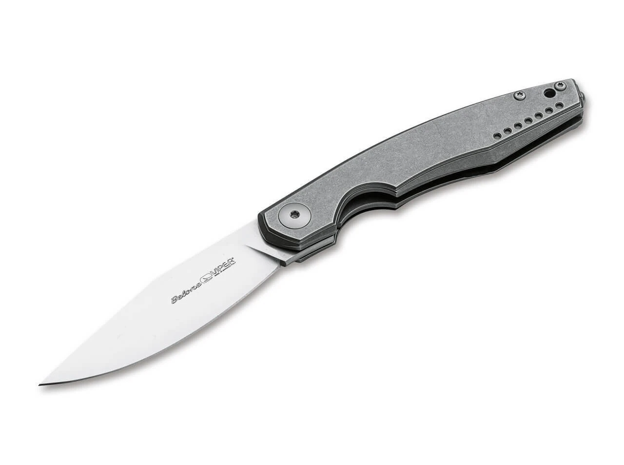 Mit dem Belone haben Jesper Voxnæs und Viper gemeinsam ein spannendes Projekt geschaffen, das die Linien eines klassischen italienischen Schäfermessers mit der Anmutung und den Materialien des modernen Taschenmesserbaus verbindet. Die schlanke Linienführung, die charakteristische mediterran inspirierte Klinge, der Flipper sowie das Kugellager der Klinge ergeben zusammen mit den modernen Griffmaterialien und dem pulvermetallurgischen M390 als Klingenstahl ein ausgesucht exquisites und elegantes Taschenmesser für den Alltag. Mit Titanclip. Verriegelung per Linerlock. Mit grauem Titangriff.