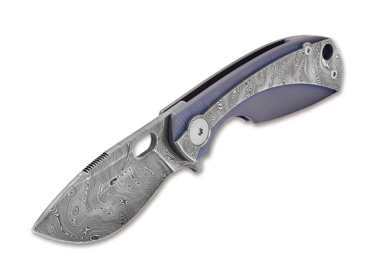 Die exklusivste Version des Lille von Jesper Voxnæs besitzt eine Klinge aus dem pulvermetallurgischen Damasteel, der sich nicht nur durch seine hervorragende Korrosionsresistenz auszeichnet, sondern auch durch seine hohe Härte und Schnitthaltigkeit, weshalb er sich auch im Alltagseinsatz bestens bewährt. Als Damastmuster kommt hier Björk Twist zum Einsatz. Der Titangriff trägt ein Overlay, das ebenso wie die Klinge des Framelock-Messers aus Damasteel Björk Twist gefertigt ist und so dem Messer eine besonders hochwertige Anmutung verleiht. Die kugelgelagerte Damastklinge öffnet per Flipper oder per Daumenloch. Ein überaus eleganter und eigenwilliger Folder, der dem Begriff des Gentleman-Messers eine neue Dimension verleiht. Geliefert wird das Lille Damasteel Blue in einer runden Holzschatulle. Dem Messer liegen noch kleine Anhänger aus dem gleichen Damasteel bei, mit denen der Besitzer seine Liebe zu diesem exquisiten Material zum Beispiel an einer Halskette nach außen tragen kann.